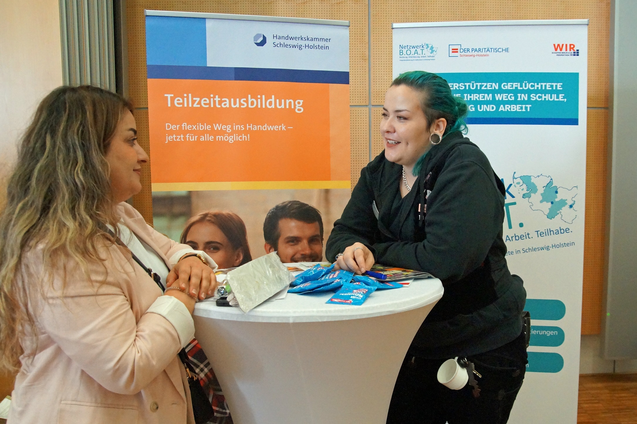 Vaman Sindi (li.) ergriff die Gelegenheit, um sich bei Leo Nickel von der Handwerkskammer über die Friseurausbildung in Teilzeit zu informieren. Für die Mutter von drei Kindern eröffnet dieses Modell eine echte Chance, ihren Traumberuf zu erlernen und gleichzeitig ihren familiären Verpflichtungen gerecht zu werden. „Der Infotag zeigt uns jedes Jahr aufs Neue, wie groß der Bedarf an Orientierung und gezielter Unterstützung ist, betont Mitinitiatorin vom Jobcenter Claudia Schmutzer. Frauen, die ihre berufliche Zukunft gestalten wollen, profitieren von einem Überblick über die vorhandenen Angebote – und vom persönlichen Austausch, der Mut macht. Ich freue mich darüber, dass der Infotag erneut so gut besucht ist und danke allen Teilnehmerinnen des Netzwerkes, die diesen Tag so engagiert umgesetzt haben.“