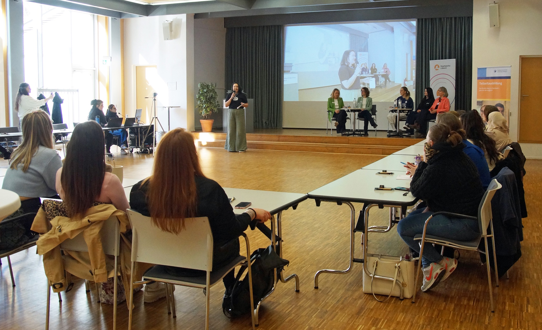 Zahlreiche Interessierte nutzten die Gelegenheit, sich über diese besondere Form der Ausbildung zu informieren. Dabei konnte vor Ort bei der Handwerkskammer oder per Livestream teilgenommen werden. Schnell wurde deutlich: Das Thema bewegt viele, denn eine Ausbildung in Teilzeit eröffnet echte Chancen für Menschen, für die eine klassische Vollzeitausbildung gerade nicht machbar ist. Für die Besucher:innen gab es im Anschluss an die Vorträge ein Beratungsangebot, Bewerbungsmappencheck und Berufsorientierung von Partner:innen wie zum Beispiel der Beratungsstelle Frau & Beruf. „Die Ausbildung in Teilzeit verläuft im Grunde wie eine Vollzeitausbildung – nur, dass die tägliche/wöchentliche Ausbildungszeit im Betrieb individuell verkürzt wird. Das Ausbildungsmodell zeigt sich flexibel und passt sich den Lebensbedingungen der Auszubildenden an“, erklärt Leo Nickel, Fachberaterin für das Projekt „Teilzeitausbildung für alle!“ der Handwerkskammer Lübeck.